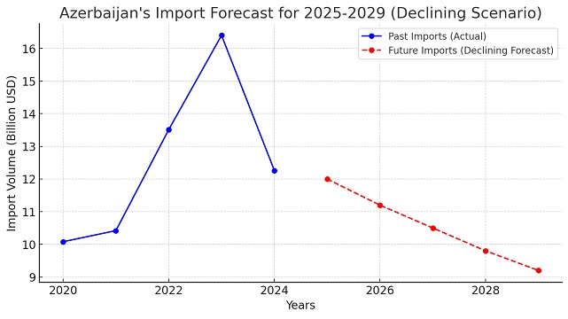Source: [2] Looking at the presented table data, the following conclusions can be drawn: 1. Overall Import Dynamics. From 2020 to 2024, the following main trends in imports are observed: In 2020, imports amounted to $ 10.08 billion and decreased by 11.1% compared to the previous year. This decline was mainly due to global trade restrictions and weakening of domestic economic activity during the pandemic. In 2021, imports increased by 3.4% to $ 10.42 billion. The recovery of the global economy has increased import demand. In 2022, imports increased by 129.7% to $ 13.51 billion. This is mainly explained by the increase in imports of equipment and technologies related to projects in the energy sector and infrastructure development. In 2023, imports reached $ 16.4 billion. The growth was 21.4 per cent, and there is an impact of development in the non-oil sector. And in 2024, imports fell to $ 12.26 billion. This is mainly due to the fact that the national currency remains stable and some of the imports are replaced by local production. 2. Distribution Of Imports By Region. Imports are mainly divided into two categories: a) import from CIS countries In 2020, it was $ 2.57 billion and accounted for 25.5% of total imports. In 2022, it showed an increase of 4.11%, reaching $ 158.2 billion. This is mainly due to the import of agricultural products and industrial equipment from Russia. And in 2024, imports from the CIS countries fell to $ 3.18 billion. This may be due to the development of local alternatives on the Azerbaijani market and the indirect influence of international sanctions against Russia [3]. b) import from non-CIS countries. In 2020, it was $ 7.50 billion and accounted for 74.5% of total imports. In 2022, it showed an increase of 9.39%, reaching $ 120.2 billion. And in 2023, it increased to $ 11.91 billion, indicating that Azerbaijan imports more technology and industrial products, mainly from the markets of Europe, China and Turkey [4]. In 2024, imports from non-CIS countries fell to $ 9.07 billion. This indicates that Azerbaijan is diversifying imports and reducing dependence on imports in certain areas. 3. Causes and effects of imports. The main factors affecting the change in imports: a) domestic demand and economic development. As the economic recovery took place in 2022-2023, imports also increased. In 2024, a certain lag is observed, which may be the result of a policy of strengthening domestic production and import substitution. b) Energy and infrastructure projects. Modernization in the oil and gas sector and the development of transport infrastructure have increased imports. Imports of machinery and equipment for Transport and logistics projects in Azerbaijan have increased. c) global economic trends and exchange rates. Price changes and inflation in world markets have affected Azerbaijan's import costs. The stability of the Azerbaijani manat has relatively stabilized import processes. During 2020-2023, there is a general increase in imports, which is due to economic development and increased demand for foreign markets. In 2024, imports decreased, which is due to the fact that domestic production to some extent replaces imports and balances the balance of foreign trade. Azerbaijan has reduced imports from CIS countries and increased trade with non-CIS countries, which is an indicator of its diversification strategy. In the future, the main directions of imports will be industrial equipment, technology and agricultural products. These trends show that Azerbaijan's foreign trade policy is aimed at reducing dependence on imports and developing the non-oil sector. In accordance with the presented import indicators, we believe that dependence on imports may decrease for the next 5 years. for this, certain steps must be taken (see graph 2) Graph 2. Source: Compiled by the Author according to Table 2. In order for the import forecast for the next 5 years to be in a positive trend, a number of steps should be taken to regulate foreign trade activities in Azerbaijan: 1. Development of domestic production Industrial parks and production facilities should be increased – especially in the non-oil sector, production should be expanded. ü Technology and innovation must be supported – domestic manufacturers must gain access to modern technologies and increase competitiveness [6]. ü Agricultural production should be strengthened-in the agricultural sector, subsidies and technical support should be increased to replace imported products with domestic ones. 2. Application of import substitution policies ü Import duties may be increased for certain strategic products, which will help protect domestic producers. ü Support for export-oriented companies should be increased, thus the country will both reduce dependence on imports and increase sales abroad. ü Local brands should be developed and promoted, consumers should be encouraged to give preference to local products. 3. Development of alternative sources of energy and raw materials ü Investment in alternative energy sources should take place-the transition to domestic production of imported energy equipment should take place. ü The production of raw materials should be increased – in order to reduce the dependence of the industrial sector on imports, the production of raw materials in the country should be expanded. 4. Strengthening logistics and infrastructure ü Internal transport systems should be strengthened – roads, railways and logistics centers should be developed to facilitate the delivery of products from production to the consumer. ü Customs and trade procedures should be optimized – effective trade rules should be applied to prevent imports. 5. Financial and credit support ü Local companies should be provided with soft loans and investment support so that they can produce alternative products to imported goods. ü Tax benefits should be applied to enterprises producing innovative and high-tech products. The re
