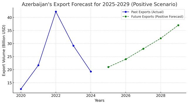 In the future, Azerbaijan's export strategy should focus on the development of the non-oil sector. Dependence on oil and gas exports should be reduced, agriculture, non-oil industry and exports of high-tech products should be expanded. In the event of continued instability in the energy markets, Azerbaijan's export revenues may again be at risk of declining. Therefore, the country should diversify its export markets and expand cooperation with new trading partners. The dominant role of oil and gas remains in Azerbaijan's export structure, but the non-oil sector needs to be developed. Exports with the CIS countries are relatively stable, but significant changes are observed in non-CIS markets. The country's trade policy should be aimed at diversifying exports and exploring new markets. In the graph presented below is the forecast of exports for the next 5 years (see graph 1)