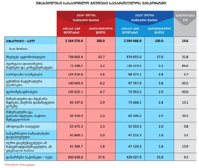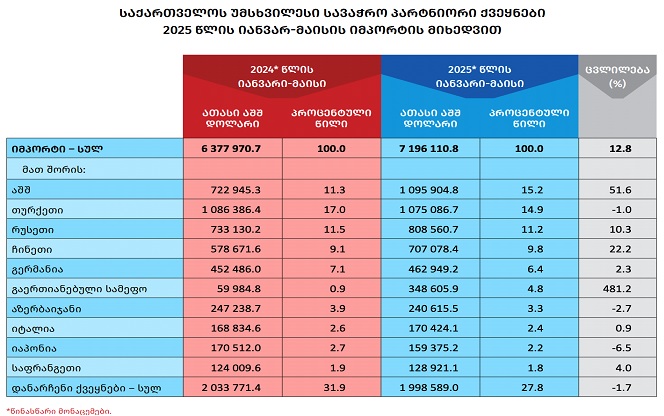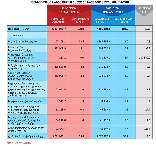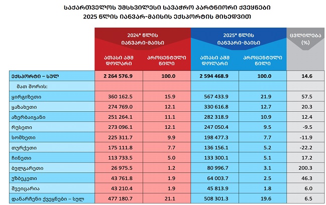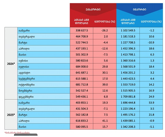 ∘ გიორგი ბრეგვაძე ∘ ექსპორტ-იმპორტი საქართველოში ანოტაცია. ნაშრომი მიმოიხილავს ექსპორტისა და იმპორტის დინამიკას საქართველოში 2024-2025 წლებში, ფოკუსით 2025 წლის იანვარ-მაისის მაჩვენებლებზე. აქვეგაანალიზებულია საგარეო ვაჭრობის სტატისტიკური მონაცემები, სავაჭრო ბრუნვის სტრუქტურა, სავაჭრო დეფიციტის მასშტაბები, ასევე მთავარი სავაჭრო პარტნიორი ქვეყნები და სასაქონლო ჯგუფები. ნაშრომში წარმოდგენილია ექსპორტისა და იმპორტის გავლენა ეკონომიკაზე, კონკურენტუნარიანობასა და ქვეყნის სტრატეგიულ პერსპექტივებზე. კეთდება დასკვნები და რეკომენდაციები სავაჭრო დივერსიფიკაციისა და ეკონომიკური მდგრადობის უზრუნველსაყოფად. საკვანძო სიტყვები: ექსპორტი, იმპორტი, საგარეოვაჭრობა, ბრუნვა. შესავალი იმპორტი წარმოადგენს საქონლისა და მომსახურების უცხოეთიდან ქვეყნის ტერიტორიაზე შეტანის პროცესს ეკონომიკური საქმიანობის ფარგლებში. ის უკავშირდება იმ გარიგებებს, როდესაც ქვეყნის ეკონომიკური სუბიექტები (მთავრობა, ფირმები ან პიროვნებები) ახორციელებენ პროდუქციის შეძენას სხვა ქვეყნებში მოქმედი მწარმოებლებისაგან ან მომწოდებლებისაგან. იმპორტის მიზანია ადგილობრივი მოთხოვნის დაკმაყოფილება იმ პროდუქციაზე, რომლის წარმოება ქვეყნის შიგნით არ ხორციელდება ან მისი წარმოება არაპროდუქტიულია ეკონომიკური, ან ტექნოლოგიური თვალსაზრისით. ექსპორტი არის ქვეყნის ტერიტორიაზე წარმოებული საქონლის ან მომსახურების გატანა საერთაშორისო ბაზრებზე, უცხო ქვეყნის ეკონომიკურ სუბიექტებთან სავაჭრო ურთიერთობის ფარგლებში. ექსპორტის განხორციელება აძლიერებს ქვეყნის ეკონომიკურ პოტენციალს, ზრდის სავალუტო შემოსავლებას და ხელს უწყობს ეროვნული წარმოების სტიმულირებას. * * * 2025 წლის იანვარ-მაისში საქართველოში საქონლით საგარეო სავაჭრო ბრუნვამ (არადეკლარირებული ვაჭრობის გარეშე) 9 790.6 მლნ. აშშ დოლარი შეადგინა, რაც წინა წლის შესაბამის პერიოდთან შედარებით 13.3 პროცენტით მეტია. აქედან ექსპორტი 2 594.5 მლნ. აშშ დოლარს შეადგენს (გაიზარდა 14.6 პროცენტით), ხოლო იმპორტი – 7 196.1 მლნ. აშშ დოლარს (გაიზარდა 12.8 პროცენტით). საქართველოს უარყოფითმა სავაჭრო ბალანსმა 2025 წლის იანვარ-მაისში 4 601.6 მლნ. აშშ დოლარი შეადგინა, რაც საგარეო სავაჭრო ბრუნვის 47.0 პროცენტია. ქვემოთ მოცემული ცხრილი აჩვენებს 2024-2025 წლებში ექსპორტ-იმპორტის ყოველთვიურ დინამიკას აბსოლუტურ მაჩვენებლებში, ასევე მათ პროცენტულ ცვლილებას წინა წლის შესაბამის თვესთან შედარებით. ცხრილი 1[1] როგორც ცხრილიდან ჩანს, 2025 წლის პირველ თვეებში ექსპორტის მაჩვენებლებმა 