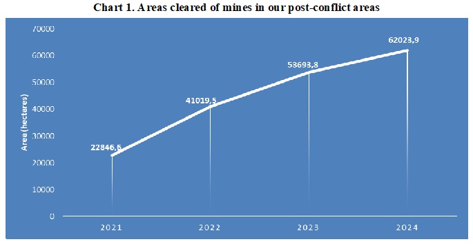 ∘ Javanshir Burhanzadeh ∘ ECONOMIC RECOVERY IN POST-CONFLICT AREAS OF AZERBAIJAN: INVESTMENT POTENTIAL AND MANAGEMENT STRATEGIES Annotation. The post-conflict areas of Azerbaijan (especially Karabakh and East Zangezur) have significant investment potential in terms of economic, social and infrastructure development. The article discusses the rehabilitation and reconstruction work carried out in Karabakh and East Zangezur and analyzes the investments directed to the post-conflict areas of Azerbaijan. The need for specific approaches, investment management strategies and efficient use of resources for the economic rehabilitation of these areas is emphasized. Keywords: post-conflict areas, Karabakh, East Zangezur, rehabilitation and reconstruction, investment activity, investment management strategies. İntroduction Economic recovery in our post-conflict areas is of paramount importance for the long-term development of Azerbaijan after its independence. The economic security of the Karabakh and East Zangezur regions is directly linked to the diversification of the non-oil sector. Post-war recovery activities are not limited to the repair of infrastructure, but are also of great importance in terms of the creation of new economic opportunities. This approach links the goal of recovery not only with the restoration of physical infrastructure, but also with the development of human capital. Without a doubt, one of the most important obstacles delaying the recovery and reconstruction process in our liberated territories is the contamination of the territory with mines. Main part Chart 1.shows the observed figures for areas cleared of mines and unexploded ordnance during 2021–2024, clearly showing how the scale and intensity of the process have changed. In 2021, the cleared area was 22,846.6 hectares, which is an indication of the activities carried out in the initial phase. In the following year, i.e. 2022, this figure increased sharply to 41,019.5 hectares, a jump of approximately 89.6% compared to the previous year [8]. In 2023, the cleared area increased to 53,693.8 hectares, with a growth rate of 26.6%. This is a reflection of some stabilization after the high growth of the previous year and a transition to more complex areas. In 2024, the cleared area reached 62,023.9 hectares, with a growth rate of 15.6%. It is clear from this that although the volume of cleared area increases each year, the growth rate is gradually decreasing. This is explained by the clearing of easier and more accessible areas in the initial stage, while as the process progresses, demining activities are carried out in areas that are risky and technically difficult. Chart 1. Areas cleared of mines in our post-conflict areas Source: Compiled by the author based on information from MTM (https://mtm.az/). Overall, the total area cleared of mines and unexploded ordnance increased by more than 171% from 2021 to 2024, which indicates significant achievements in the direction of security and land restoration across the country. The indicators show that the clearance work is being carried out systematically, consistently and on a large scale, and the continuation of this process is of great importance from both humanitarian and socio-economic perspectives. An analysis conducted by the Mine Action Agency of the Republic of Azerbaijan (ANAMA) based on official data released by it shows that 179,186 hectares of land have been cleared of mines and unexploded ordnance over the past 4 years (2021-2024). According to the Action Plan of the “I State Program on the Great Return to the Liberated Territories of the Republic of Azerbaijan”, it is noted that by the end of 2026 the area of demined areas in the liberated territories will reach 280 thousand hectares. Based on this, we can say that currently 64% of this work has been completed. Table 1. Completed highways in our post-conflict areas
