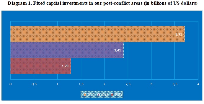 Source: Compiled by the author based on data from AAYDA (http://www.aayda.gov.az/). Currently, in accordance with the "First State Program on the Great Return to the Liberated Territories" and the orders signed by President Ilham Aliyev, work is continuing to reconstruct the road infrastructure in the liberated regions. Within this framework, the design and construction of 45 highways with a total length of 3,382.6 kilometers is being carried out. To date, the construction of 7 highways from these projects has been fully completed, and their total length is 315.9 kilometers. In addition, the construction of a 24.2-kilometer section of the Shukurbayli-Jabrail-Hadrut highway, which is planned to be 39.7 kilometers long, has already been completed [6]. According to current data, a significant increase in the number of hydroelectric power stations in Karabakh and East Zangezur is observed by “Azerenergy” OJSC. By the end of 2024, 32 hydroelectric power stations were commissioned in the region, and a total of up to 550 million kilowatt-hours of environmentally friendly, renewable “green energy” were produced through these stations. Next year, i.e. in 2025, an additional 11 new hydroelectric power stations are planned to be commissioned [3]. These facts show that “Azerenergy” OJSC continues its activities in a systematic and phased manner towards the formation of green energy zones, which contributes to the expansion of sustainable and environmentally friendly energy production in the region. According to information as of January 2025, the process of phased resettlement of the population to the territories liberated from occupation in the post-conflict period continues. To date, a total of 2,708 families, i.e. 10,665 people, have permanently settled in these territories. The largest number of resettlements was recorded in Fuzuli district - 822 families (3,132 people) were resettled here. 368 families (1,386 people) were resettled in Shusha city, and 570 families (2,090 people) were resettled in Lachin. 44 families (169 people) were resettled in Khojaly city, 357 families (1,483 people) in Jabrayil, 20 families (90 people) in Talish village of Aghdara district, 175 families (871 people) in Aghaly village of Zangilan district, 59 families (215 people) in Sus village of Lachin district, and 217 families (823 people) in Zabukh village were permanently resettled. Also, 76 families (406 people) were resettled in the village of Ballıca in the Khojaly region [7]. These indicators reflect the planned and consistent implementation of the Great Return process. At the same time, reconstruction and restoration works are being carried out at a high pace in a total of 100 settlements, including 8 cities, 8 settlements and 84 villages, within the framework of the “First State Program on the Great Return”. In addition, the foundations of 4 major industrial and agropark projects have been laid in the Karabakh and East Zangezur economic regions and their construction continues. These projects include the “Araz Valley Economic Zone” Industrial Park in Jabrayil, the “Agdam Industrial Park” in Agdam, the “Lachin Agro and Industrial Park” in Lachin and the “Dost Agropark” in Zangilan. In addition, modular medical institutions, schools and kindergartens are being built in the liberated territories to develop social infrastructure. All these steps are aimed at creating a sustainable living environment in the region and improving the well-being of the population. The volume of work carried out in the post-conflict areas of our republic in 2021-2023 is very large. It should be noted that our republic is carrying out these reconstruction and restoration works at its own expense, without any financial support from abroad. Diagram 1 depicts the investments directed to our liberated territories in 2021-2023. Karabakh and East Zangezur received $1.29 billion in 2021, $2.41 billion in 2022, and $3.71 billion in 2023. The volume of investments directed to our post-conflict territories increased by 87% in 2022 compared to the previous year, and by 54% in 2023 [2].