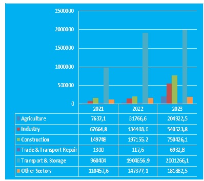 Source: Compiled by the author based on the indicators of the Statistical Bulletin "Construction in Azerbaijan" / 2024. Looking at Diagram 2, we can see that investments in post-conflict areas in the period 2021–2023 demonstrate a rapid growth dynamics overall. This growth varies both by sector and by year. While investments in agriculture per sector were $7,637.1 thousand in 2021, they increased to $204,922.5 thousand in 2023. This is an increase of approximately 27 times and indicates a significant increase in interest in agriculture. This increase is associated with the clearance of land from mines and the realization of agricultural potential. While investments in the industrial sector were $67,664.8 thousand in 2021, this figure increased 8 times to $540,523.8 thousand in 2023. This reflects steps aimed at building industrial potential and supporting local production. The construction sector is one of the areas experiencing the greatest growth. While $149,748.0 thousand was invested in this area in 2021, it increased by about 5 times in 2023 to $750,426.1 thousand. This is mainly due to the restoration and construction of infrastructure - roads, buildings, social facilities. Investments in the field of trade and repair of vehicles have been unstable. In 2021, $1,300.0 thousand was invested, in 2022 this figure decreased to $117.6 thousand (an approximately 11-fold decrease), but in 2023 it increased to $6,932.8 thousand (an approximately 5.3-fold increase compared to 2021). This change is explained by the fact that in the initial years the main focus was on infrastructure and production. The area that attracted the most investment is the transport and warehousing sector. In 2021, $960,404.0 thousand, in 2022, $1,904,656.9 thousand, and in 2023, $2,001,266.1 thousand were invested [2]. The stable and high growth in this area indicates that the establishment of transport links and the development of logistics infrastructure in the liberated territories is a priority. One of the important turning points in terms of accelerating economic development in post-conflict regions is the widespread use of digital technologies. The development of digital infrastructure in the liberated territories of Azerbaijan will make a significant contribution not only to the realization of economic potential, but also to the promotion of foreign investment [3]. Diagram 2. Investments in sectors of the economy in post-conflict areas (in thousand US dollars) Source: Compiled by the author based on the indicators of the Statistical Bulletin "Construction in Azerbaijan" / 2024. At the same time, the basis of economic revival in post-conflict regions is purposeful and sustainable development plans. Diversification of the economic structure and the application of innovative approaches play a key role in ensuring the long-term economic stability of Karabakh and East Zangezur. This recovery process should include the implementation of strategies aimed not only at solving current problems, but also at ensuring future economic sustainability. In addition, the efficient use of existing resources in areas such as industry, agriculture and tourism is also the main basis for development [4]. The transition to renewable energy sources is of strategic importance from both an ecological and economic perspective. The steps taken by Azerbaijan in the field of alternative energy will not only strengthen domestic energy security, but also regional and international energy cooperation. This approach not only enhances the country's position and geostrategic importance in the international arena, but also stimulates its participation in large-scale energy and transport projects [5]. In general, the development of the investment climate in the post-conflict regions of Azerbaijan is not limited to the restoration of physical infrastructure. The development of human resources, digitalization, stimulation of alternative energy sectors and the introduction of innovations are the main factors ensuring the sustainable economic growth of these territories. Coordinated activities in the indicated directions will make these regions even more attractive for both local and foreign investors. In this regard, there is a need to develop investment management strategies in the post-conflict regions of Azerbaijan to increase the efficiency of investment activities and attract foreign investments to our liberated territories. Formation of investment management strategies in the post-conflict regions of Azerbaijan In the liberated territories of Azerbaijan, the development of effective investment management strategies is of particular relevance in terms of ensuring economic revival, reintegration of these regions into the national economy and realization of sustainable development. As a result of long-term occupation, these territories have been almost completely destroyed in terms of infrastructure, socio-economic activity has been minimized, and investment attractiveness has been seriously damaged. In such conditions, complex and strategic approaches are needed to restore investor confidence and ensure a continuous flow of capital. First of all, it is important to improve the legal and institutional framework. The creation of a legal system that reliably protects the rights of foreign investors, ensures the resolution of disputes through international arbitration mechanisms, and minimizes risks is the main condition for confidence in the investment environment. For this purpose, it is necessary to bring the existing investment legislation into line with international standards and introduce administrative mechanisms operating on the principle of a "single window" for investors. At the same time, it is important to develop effective investment promotion mechanisms. Investors’ financial risks can be reduced through instruments such as tax and customs incentives, state guarantees, insurance programs, interest-free or low-interest loans. These in