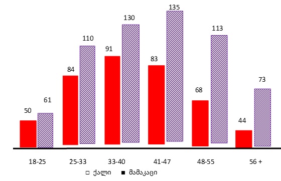 2014 2015 2016 2017 2018 2019 2020 2021 2022 წყარო: საქართველოს სტატისტიკის ეროვნული სამსახური. კერძო სექტორში დასაქმებულების საშუალო თვიური საპენსიო შენატანი (ლარებში) სქესისა და ასაკობრივი კატეგორიების მიხედვით (2023წ.) დიაგრამა 2